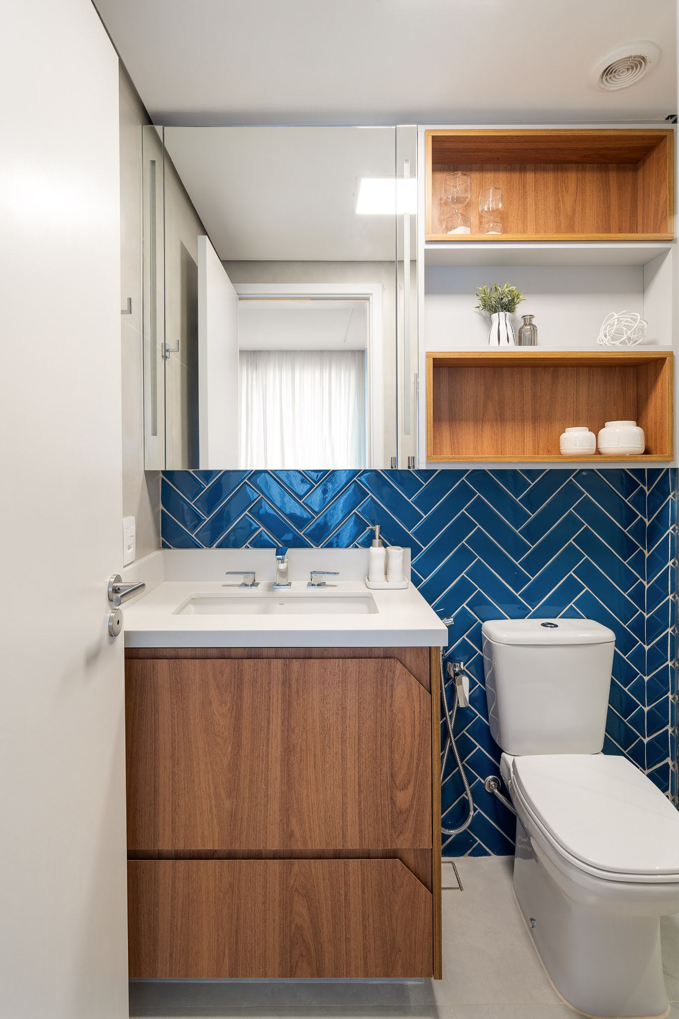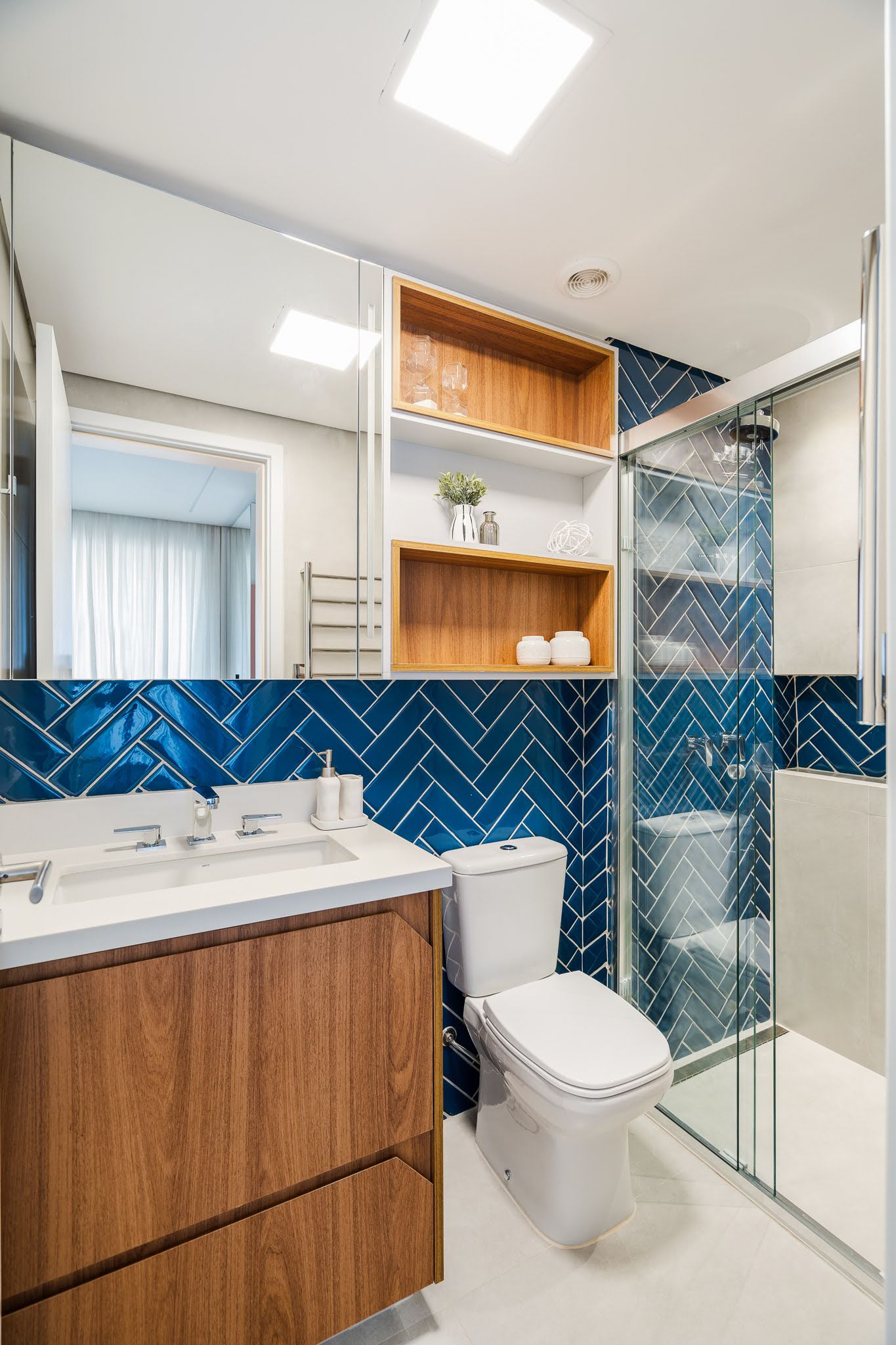 Banho suíte: Revestimento Liverpool Azul Índigo 07 X 24 CMI Portobello e Revestimento Nord Ris Natural Ret. – 90x90cm – Portobello
