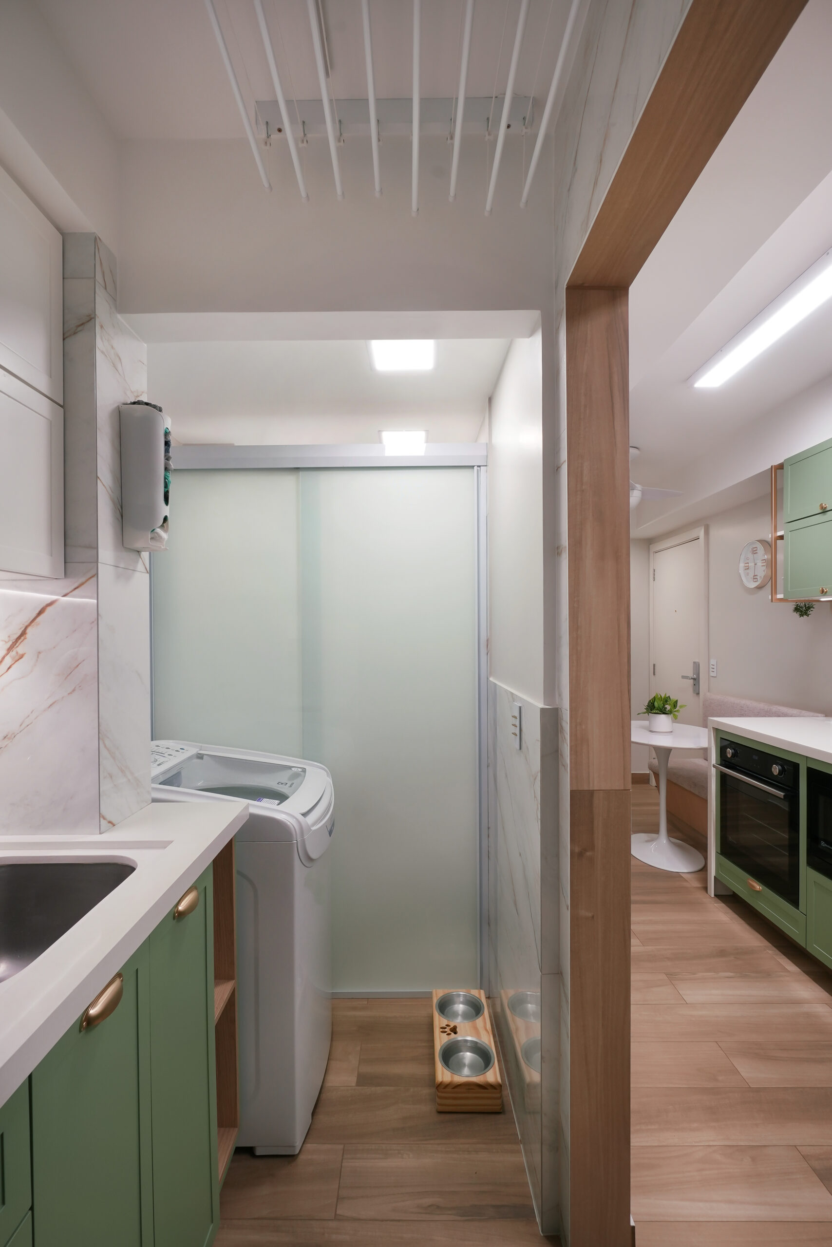 Cozinha e Área de serviço: MDF Cumaru – Arauco, MDF Grafito – Arauco e MDF Cinza Cristal Chess – Arauco