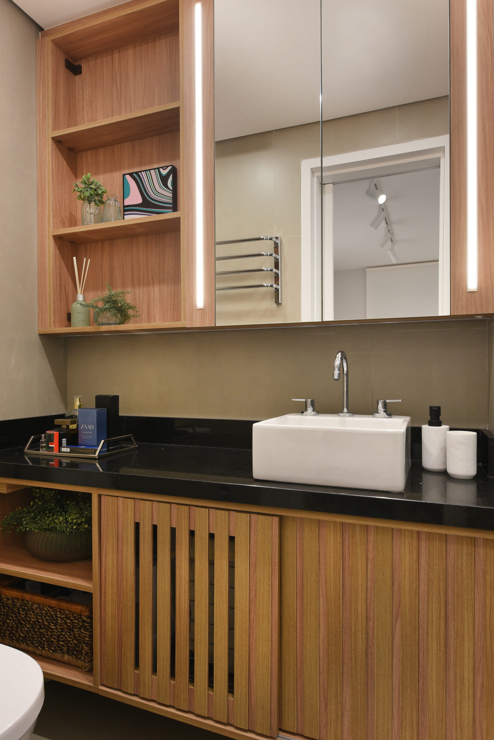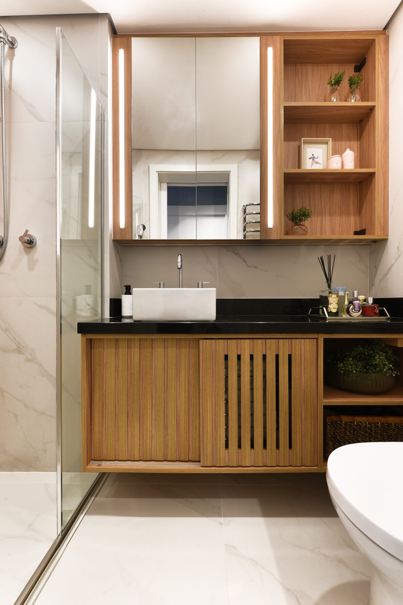 Banho Esposa e Banho Esposo: MDF Cumaru – Arauco e MDF Branco Diamante – Duratex