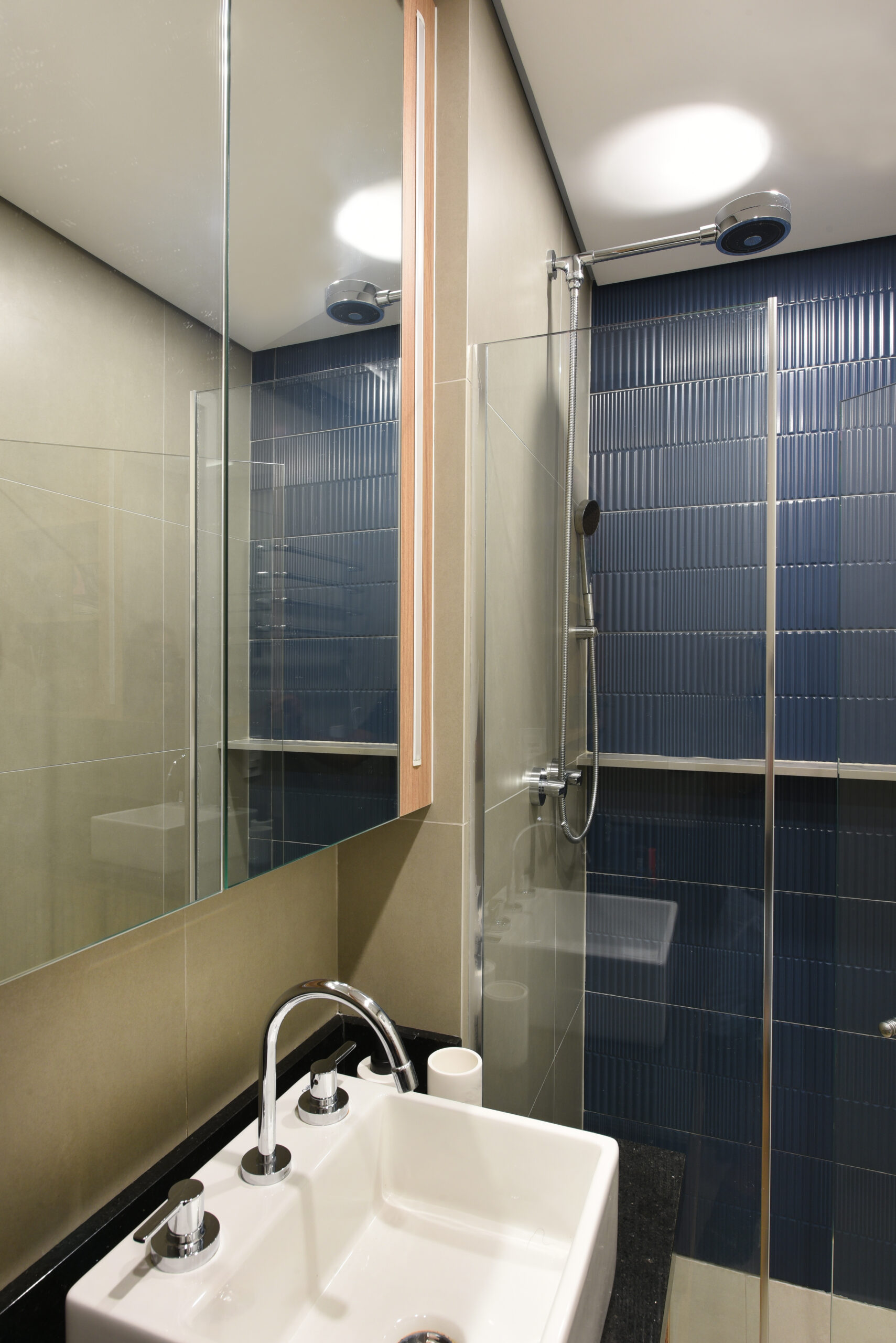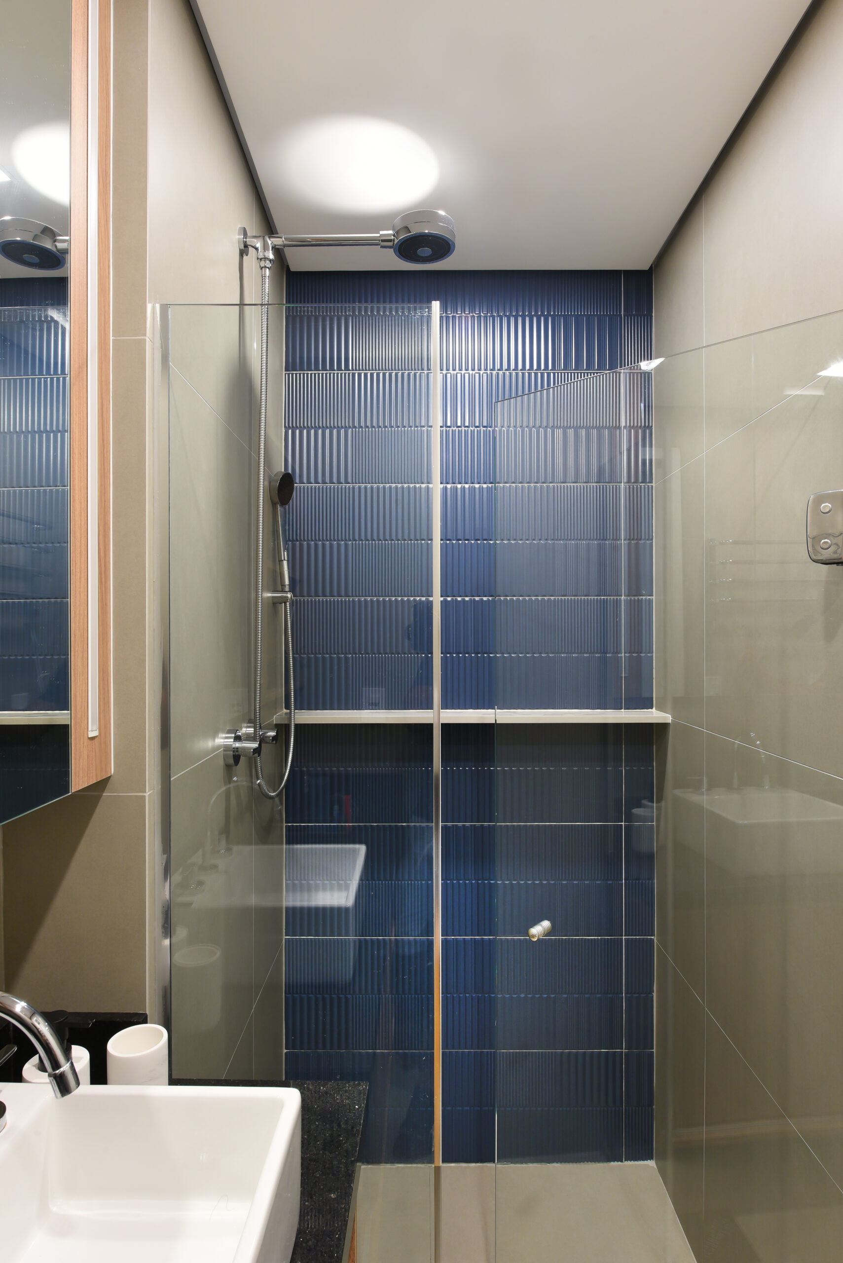 Banho Esposo: Revestimento Esmaltado Midnight Groove – 30x90cm – Portobello e Porcelanato Esmaltado Acetinado Cemento Grigio – 60x60cm – Biancogres