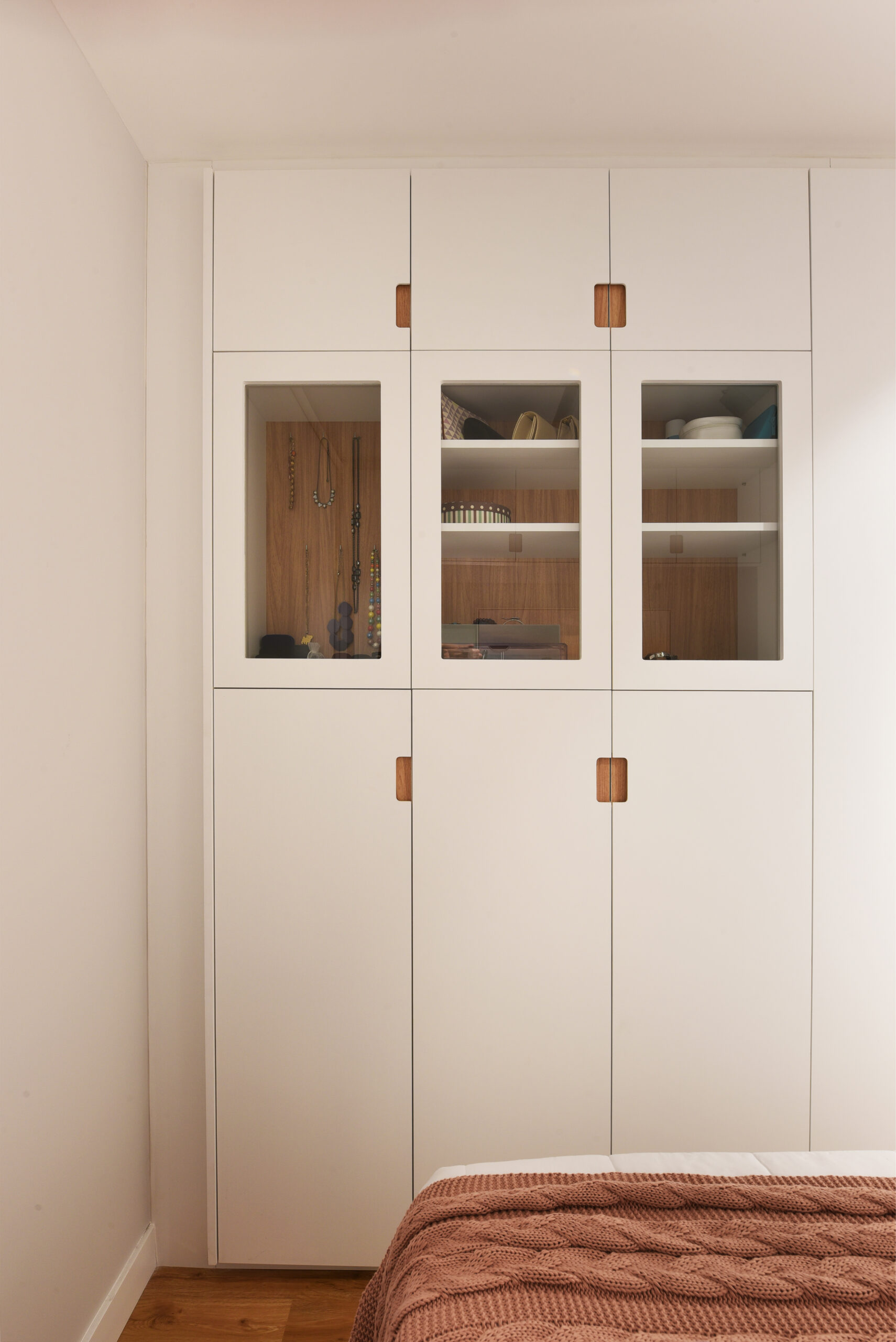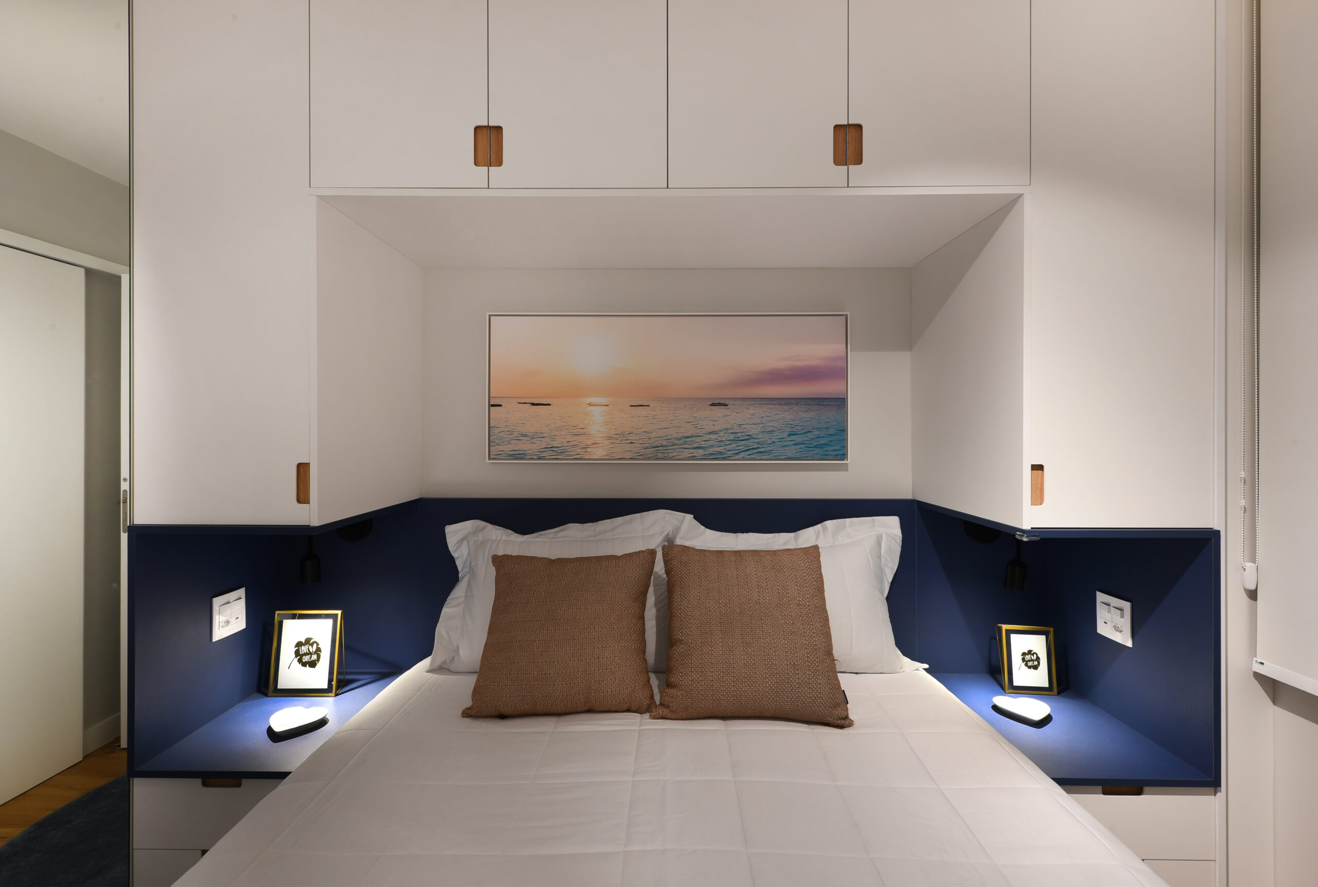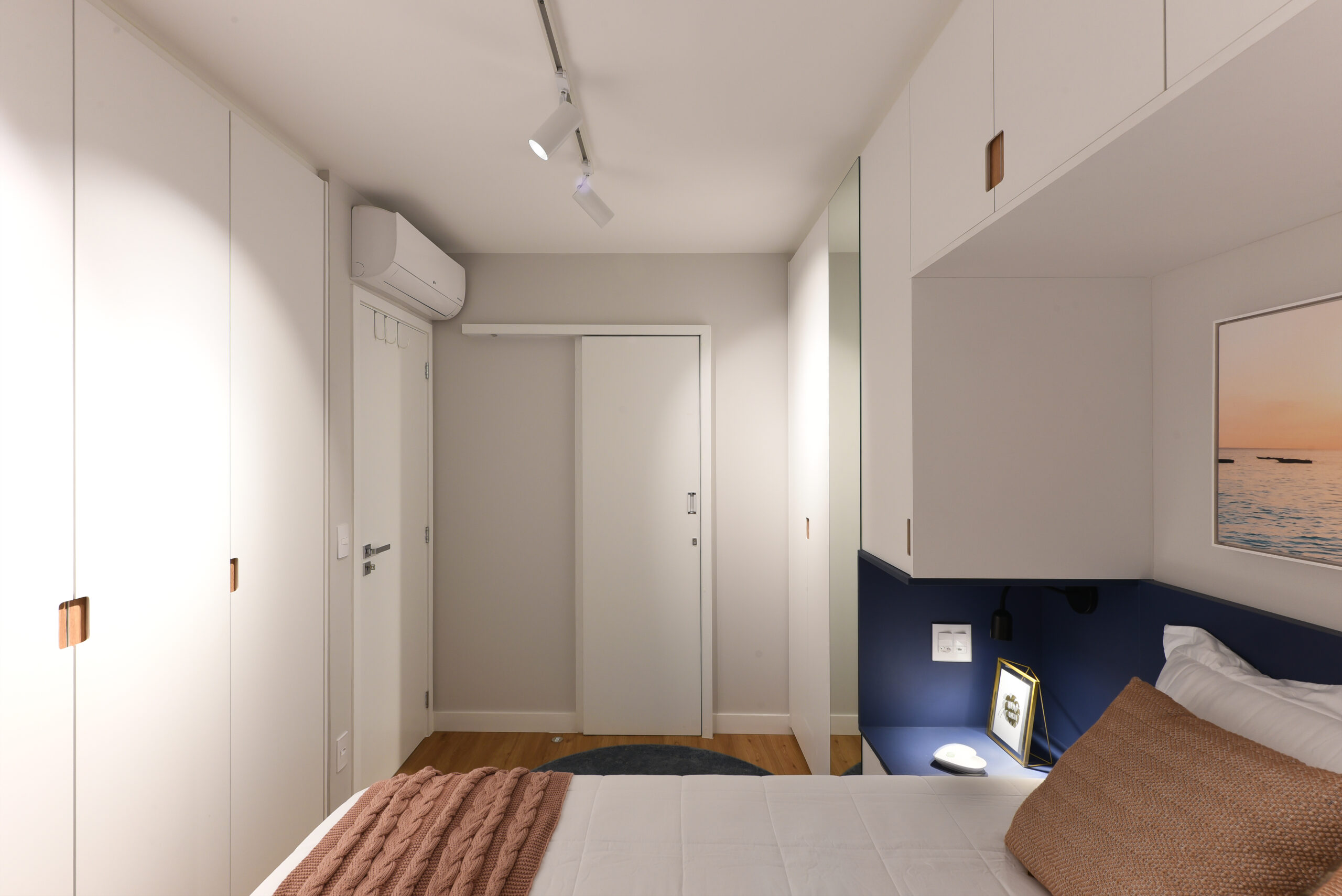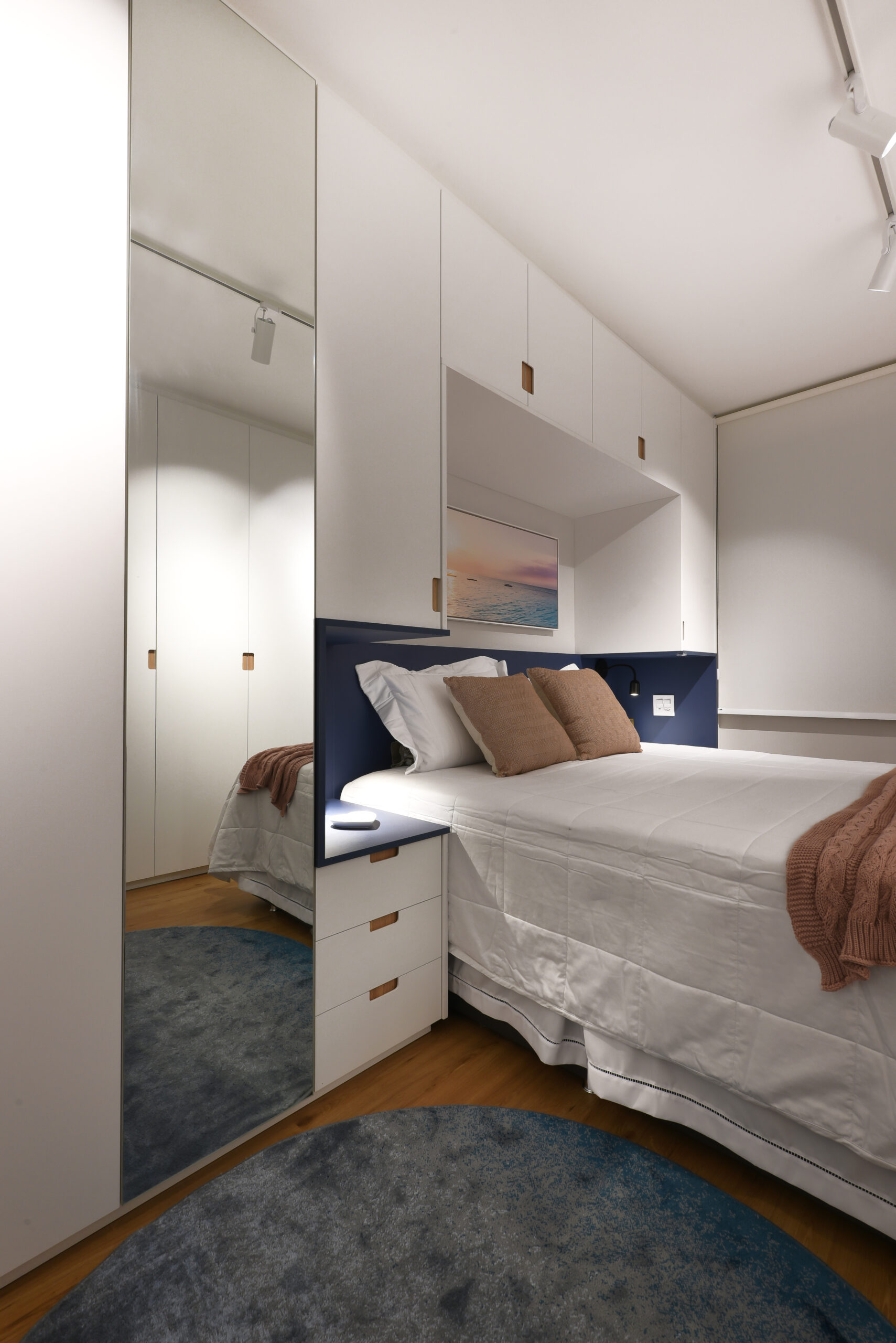 Suíte Casal: MDF Cumaru – Arauco, MDF Azulão – Arauco e MDF Branco TX