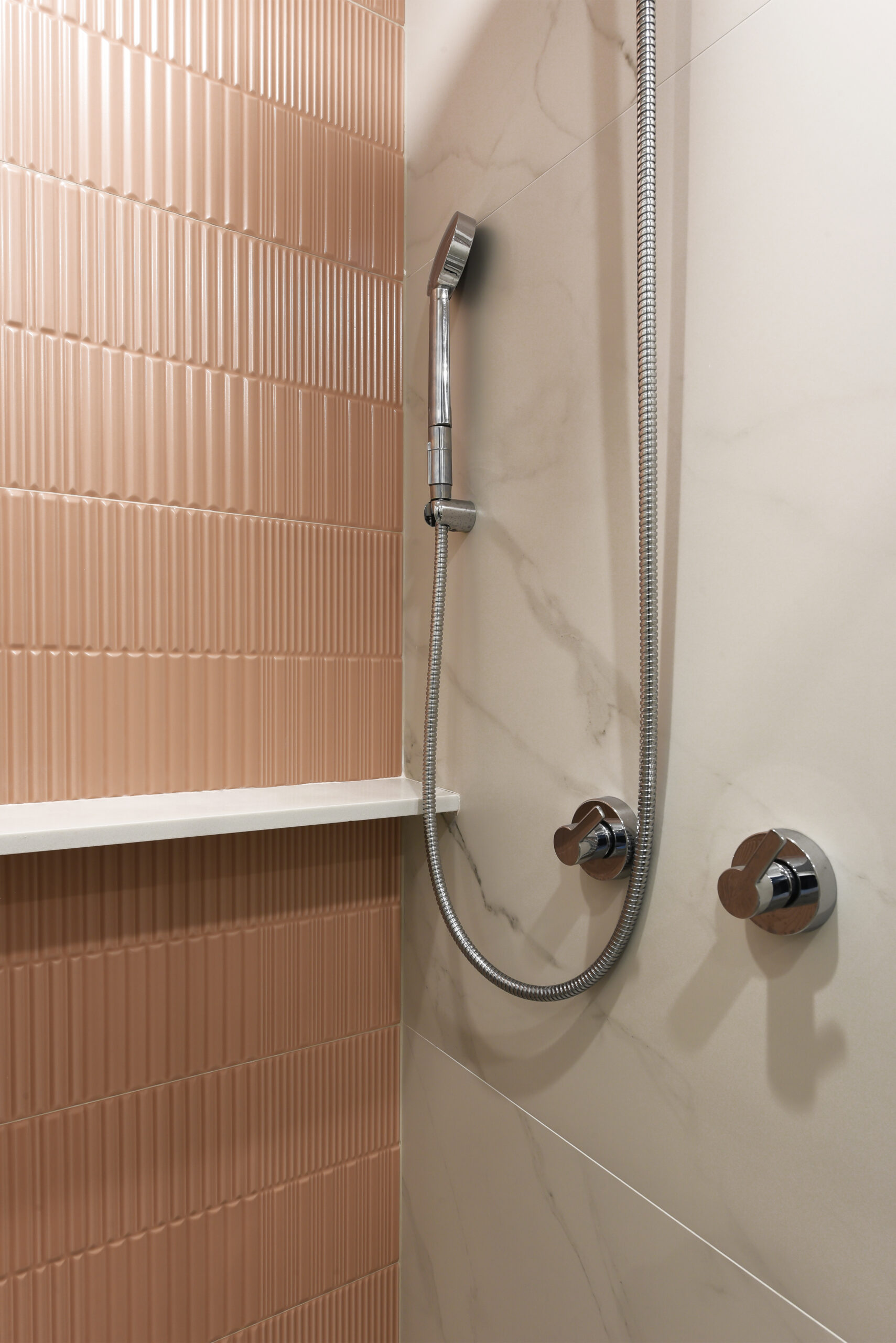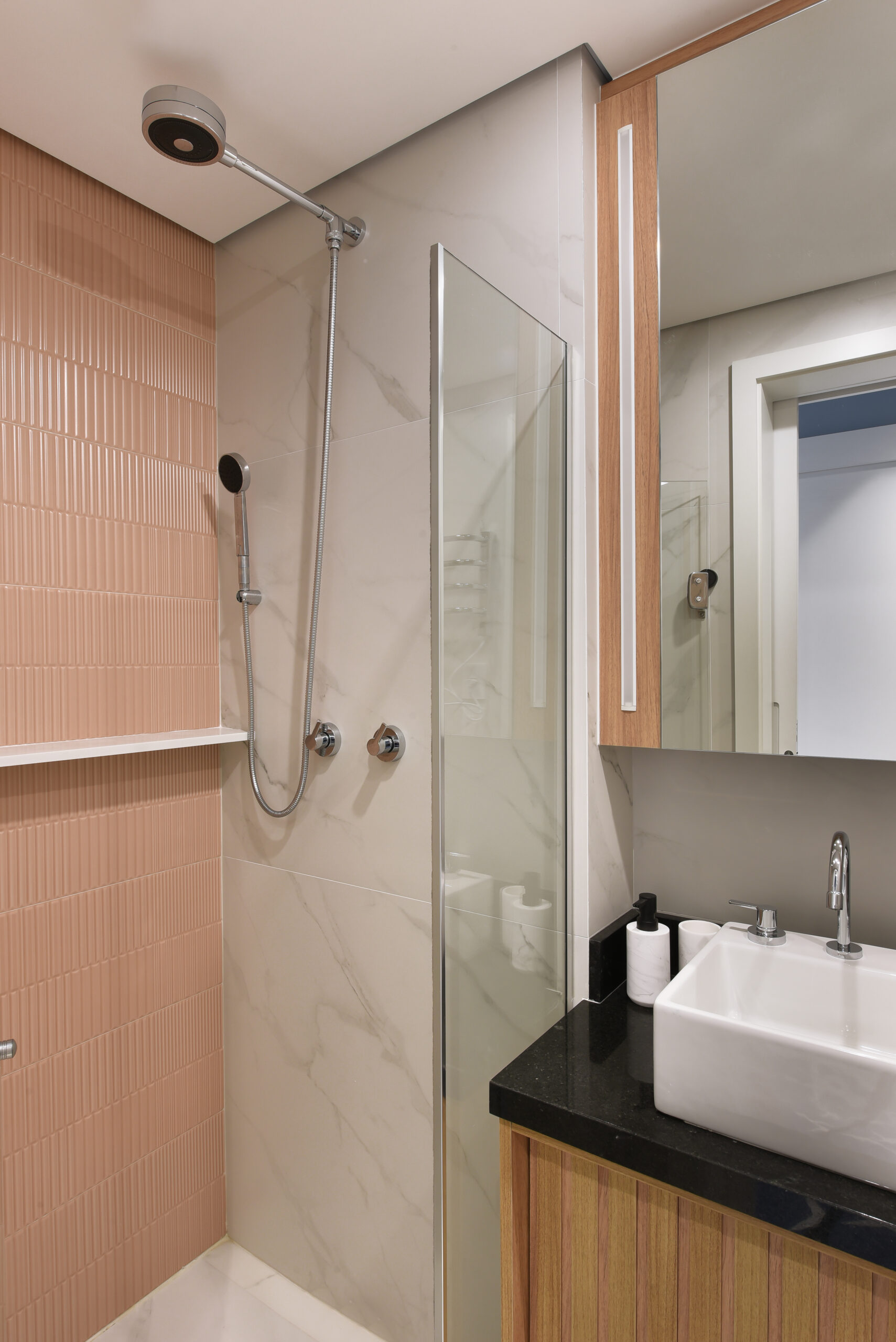 Banho Esposa: Revestimento Esmaltado Mate Old Rose Groove – 30x90cm – Portobello e Porcelanato Esmaltado Acetinado Mont Blanc – 90x90cm – Eliane