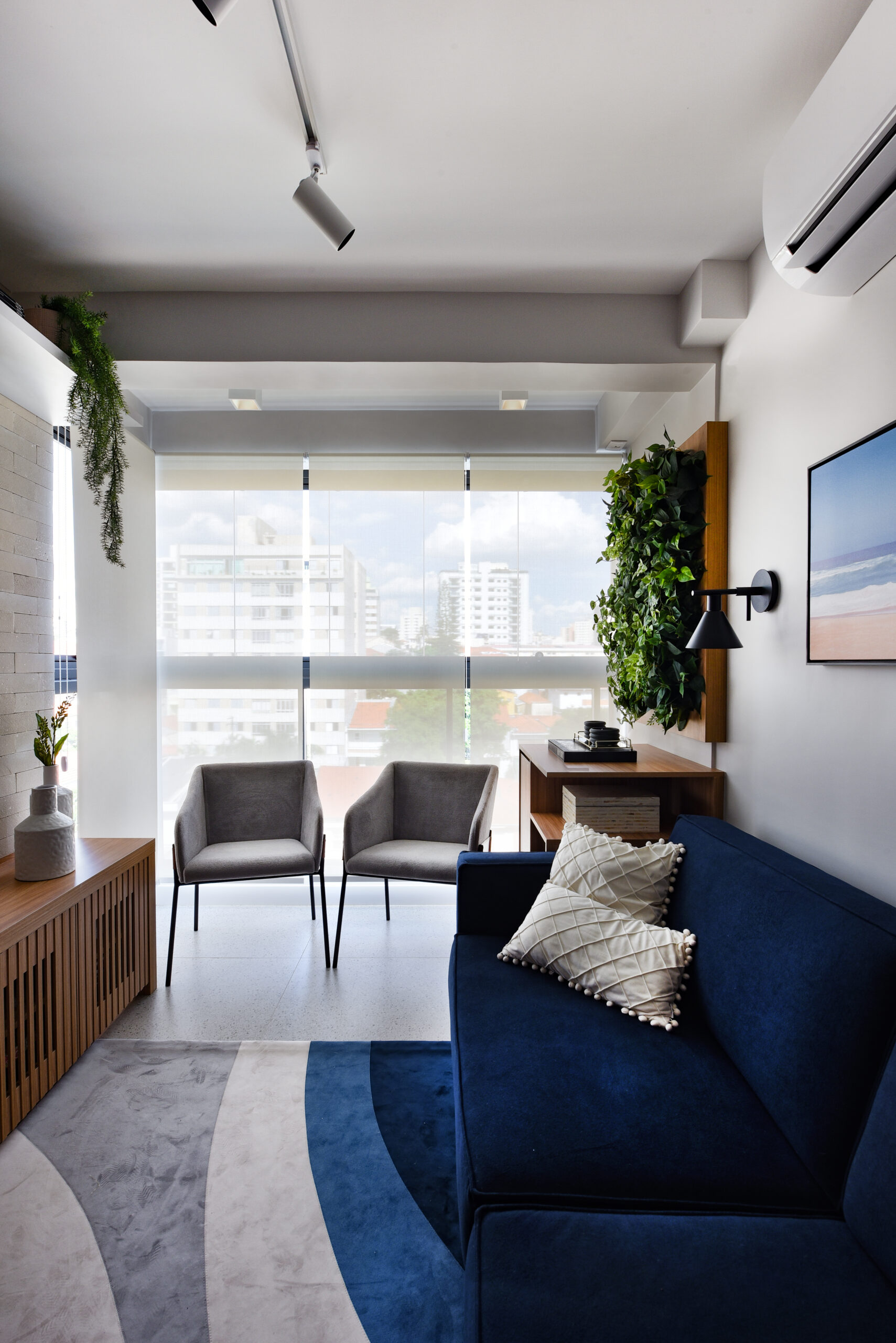 Sala de estar: MDF Cumaru – Arauco e MDF Cinza Cristal Chess – Arauco