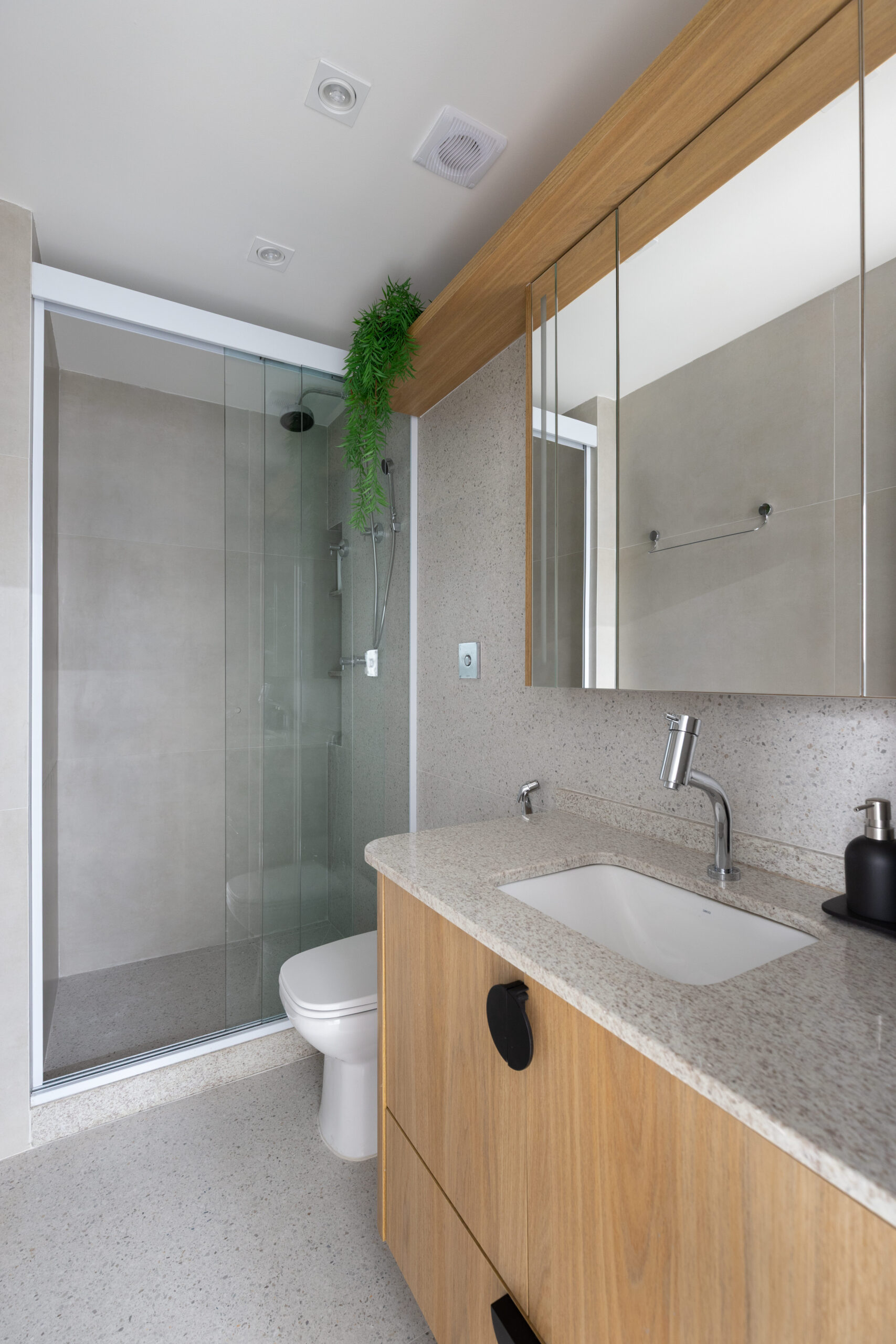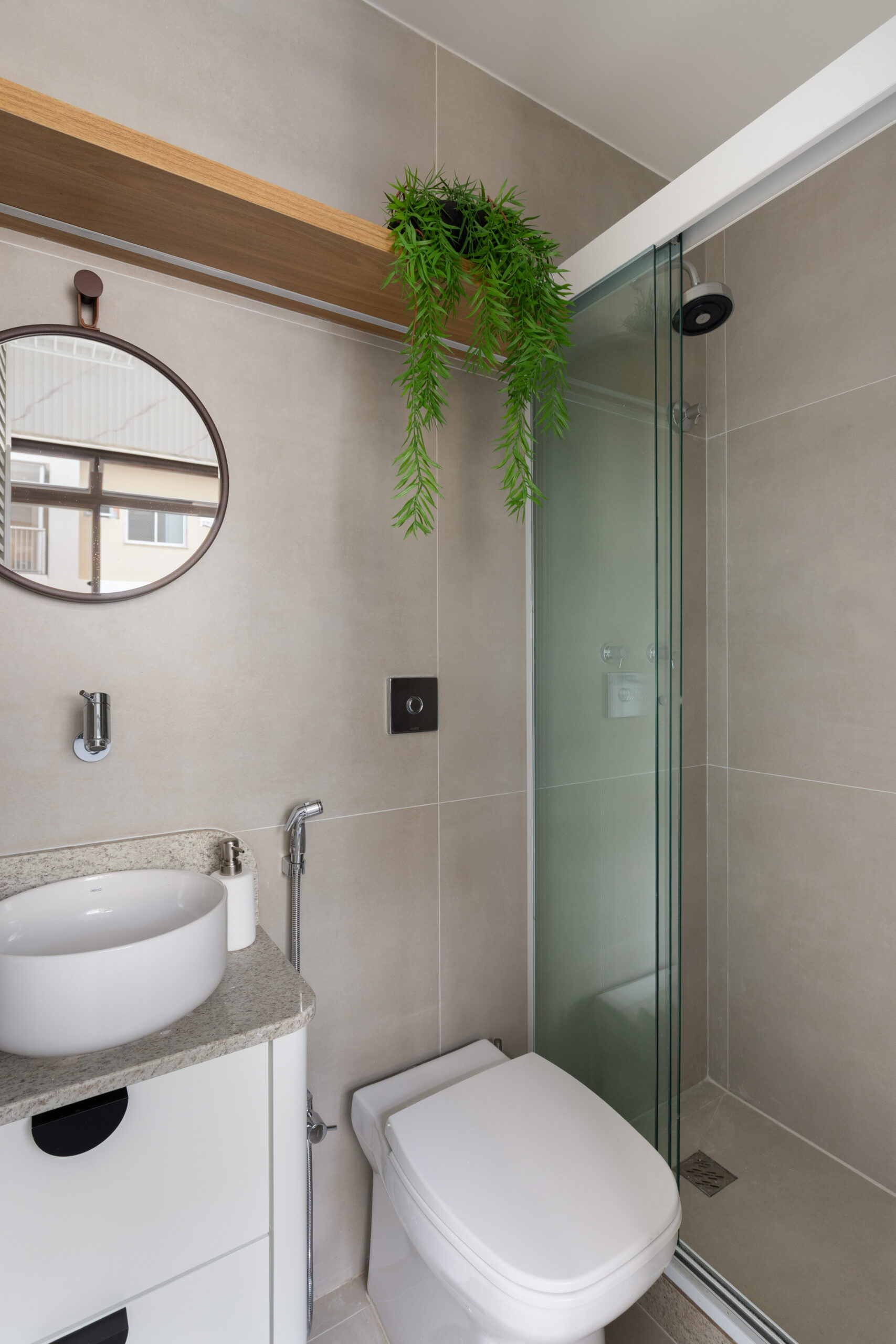 Banho Social 01 e 02, Banho Suíte: Porcelanato Munari Branco Acetinado – 90x90cm – Eliane e Porcelanato Palladio Branco Acetinado – 90x90cm – Eliane