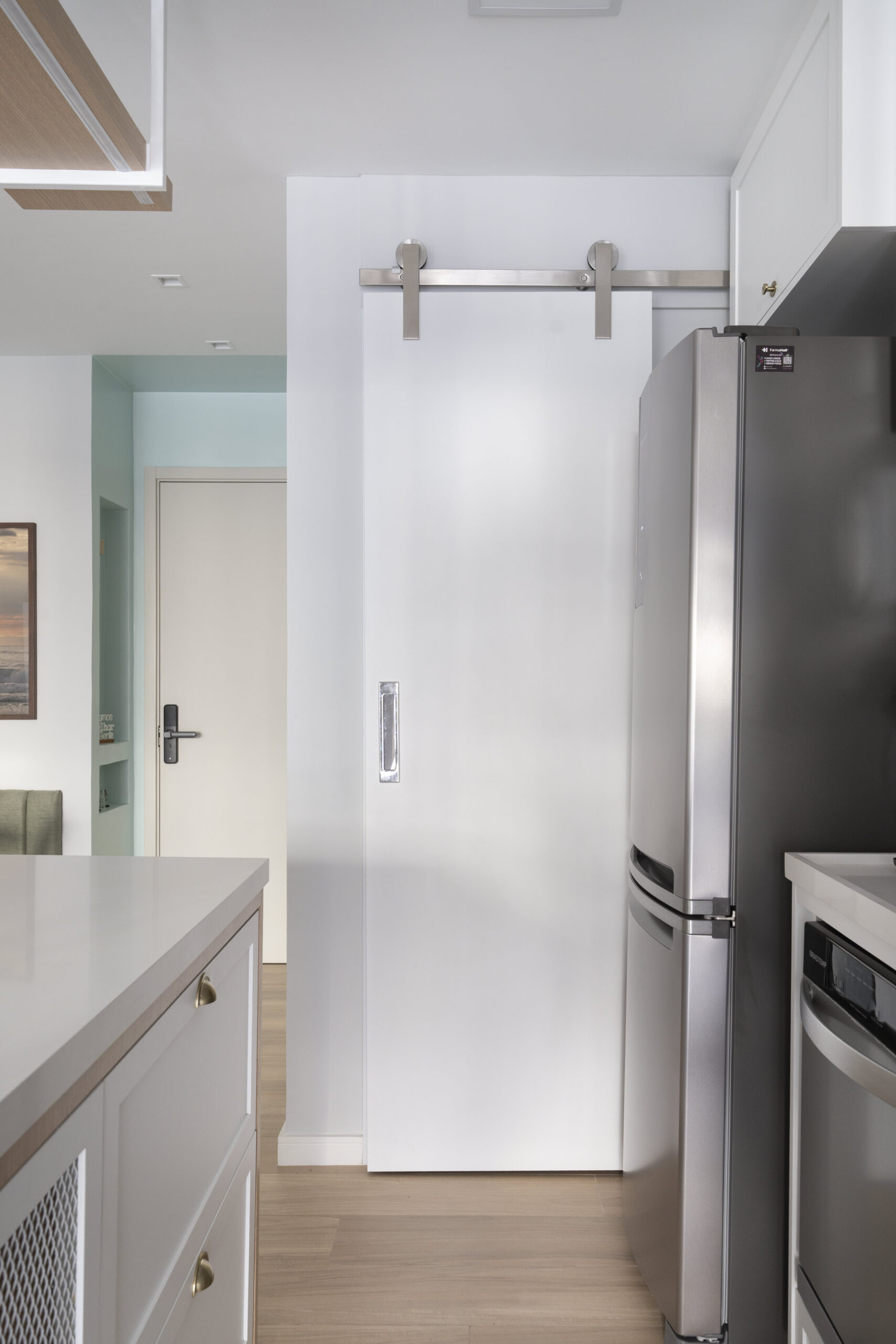 Despensa: Pintura na cor Borboleta De Jardim – Suvinil na parte superior das paredes e o restante na cor Calopsita – Suvinil