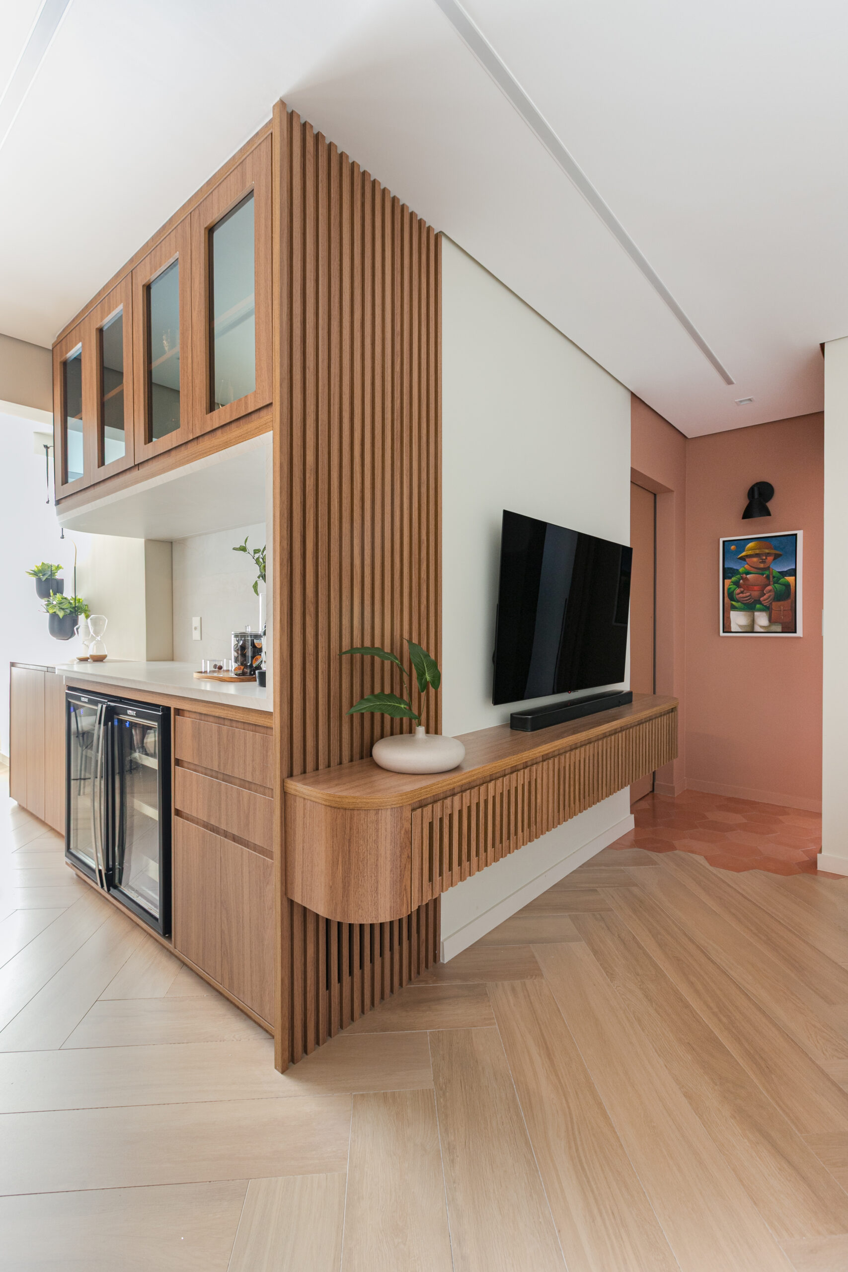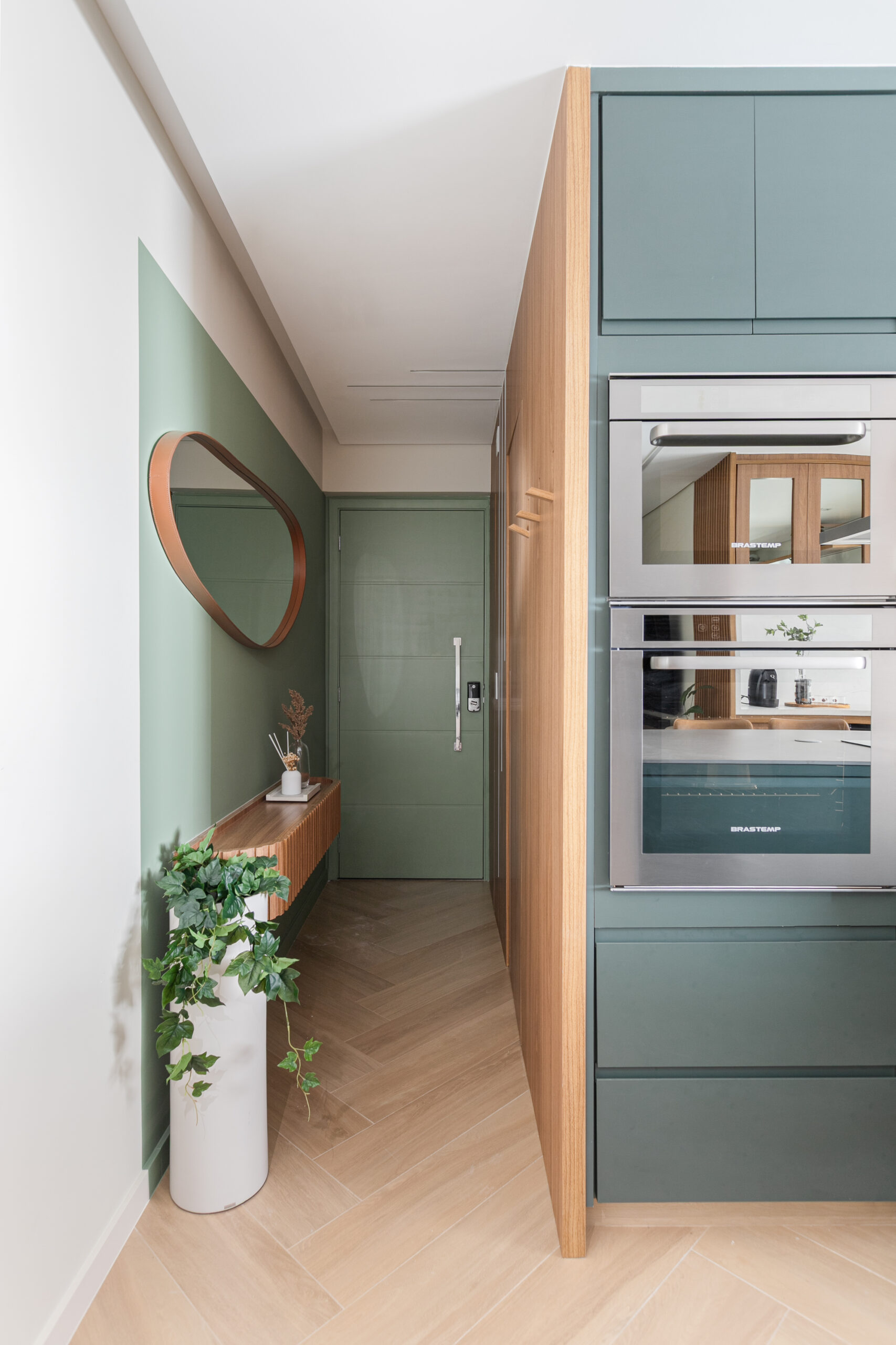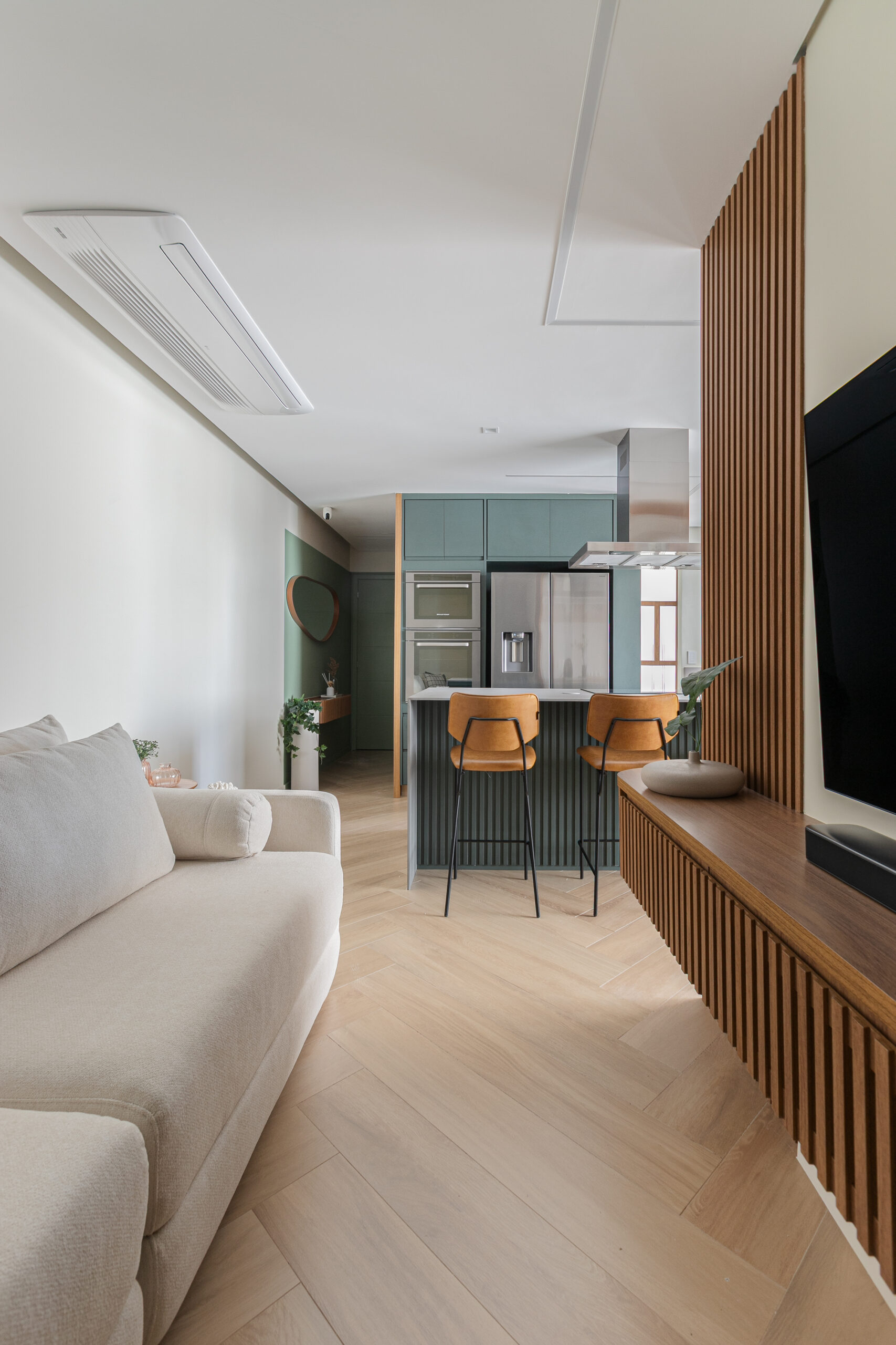O 212 é um puro charme! Um apartamento colorido e aconchegante, com um mix de tons de verde e rosa que traz leveza e personalidade. A madeira, a iluminação cênica e os detalhes ripados deixam tudo ainda mais acolhedor. Cada cantinho foi pensado pra ser funcional e cheio de alma, desde o hall verde até a cozinha que se abre pra varanda gourmet.