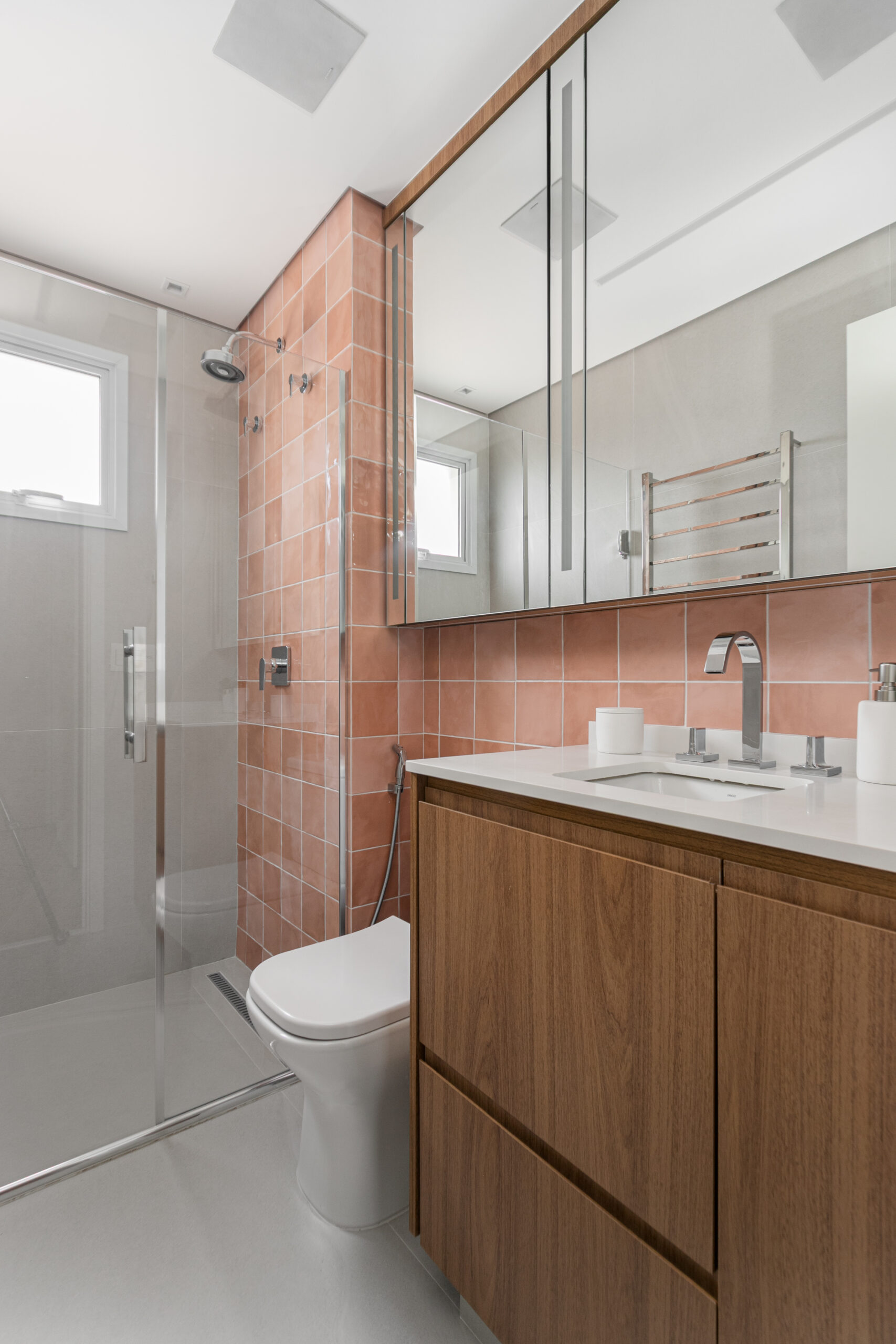 Parede Banho Suíte Master: Revestimento Gouache Flamant – 15,5×15,5cm – Portobello