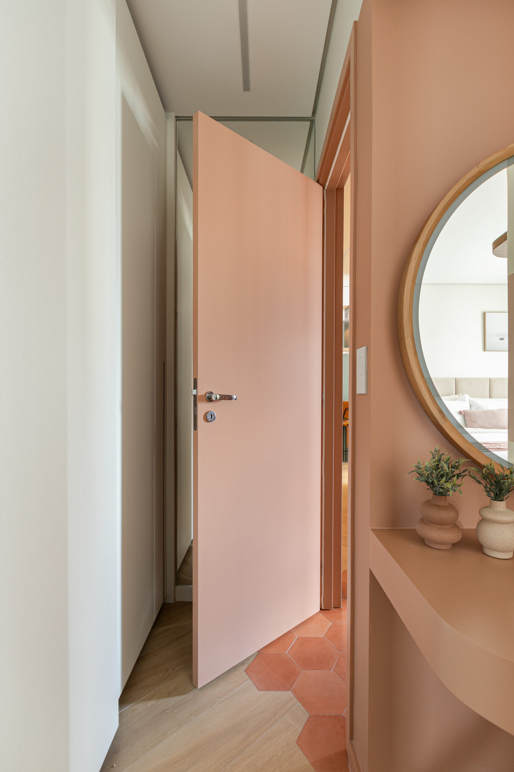 Porta Banho Suíte Master: Lado externo (Suíte Master) com pintura de tinta na cor Macramê – Suvinil