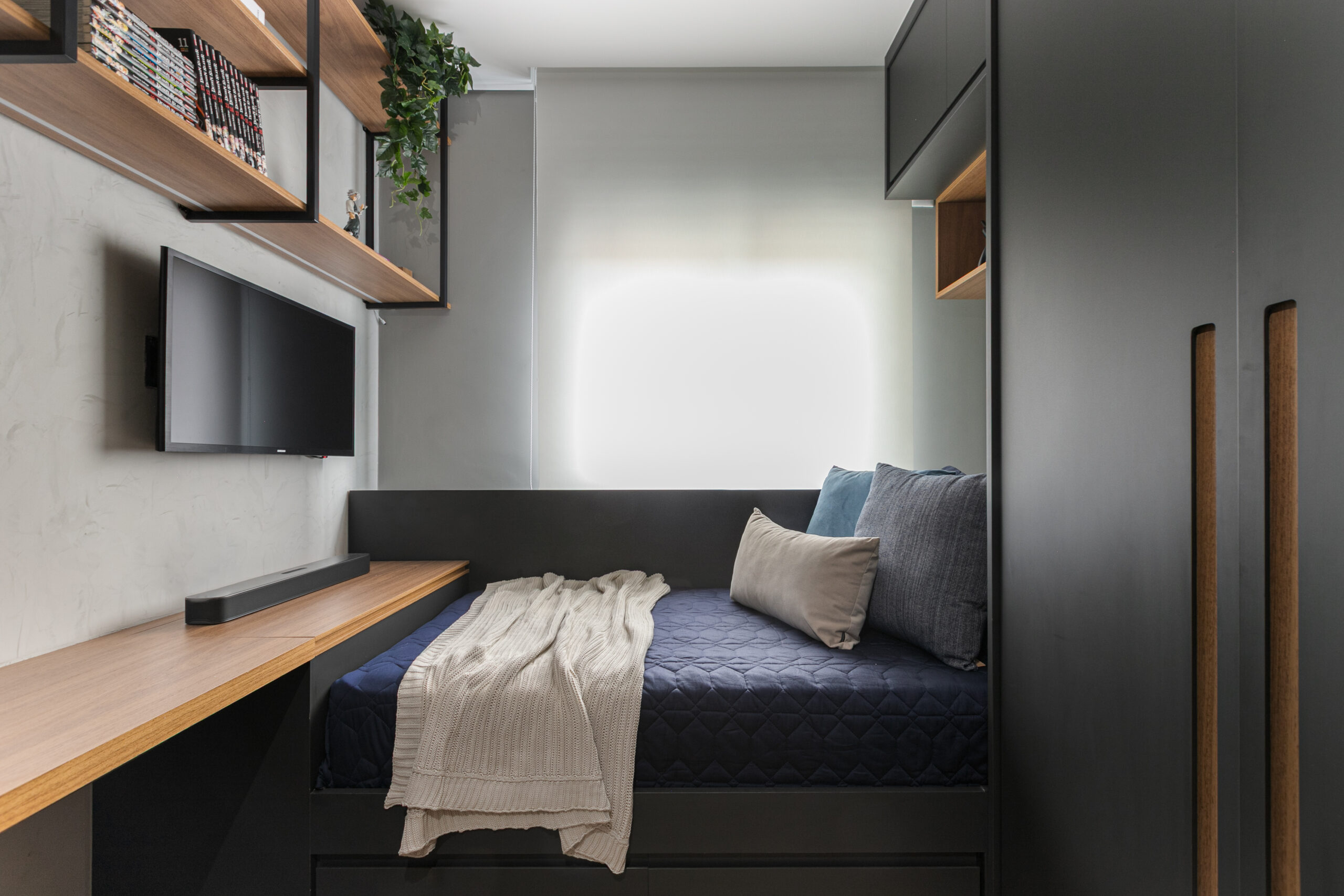 Suíte: Pintura na cor Cinza Urbano – Suvinil e textura cimento queimado cinza urbano com aplicação de cera de carnaúba – Ibratin