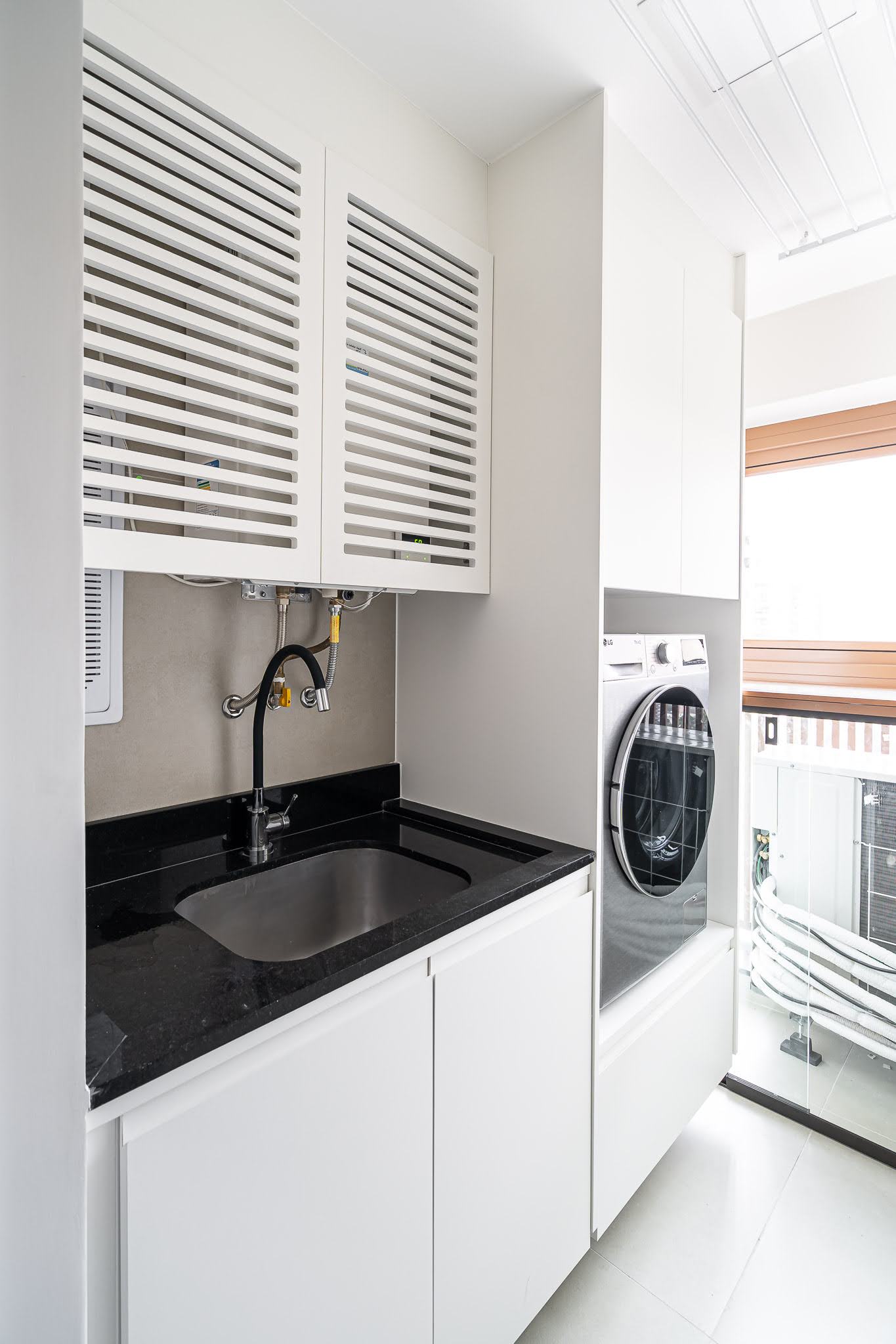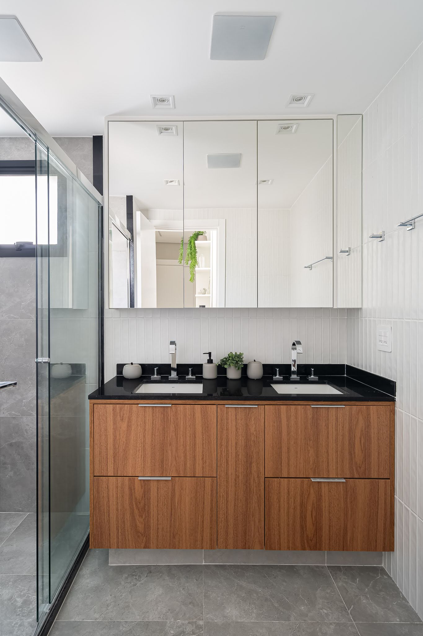 Banho Suíte Master: Bancada existente e prateleira em Granito Preto São Gabriel