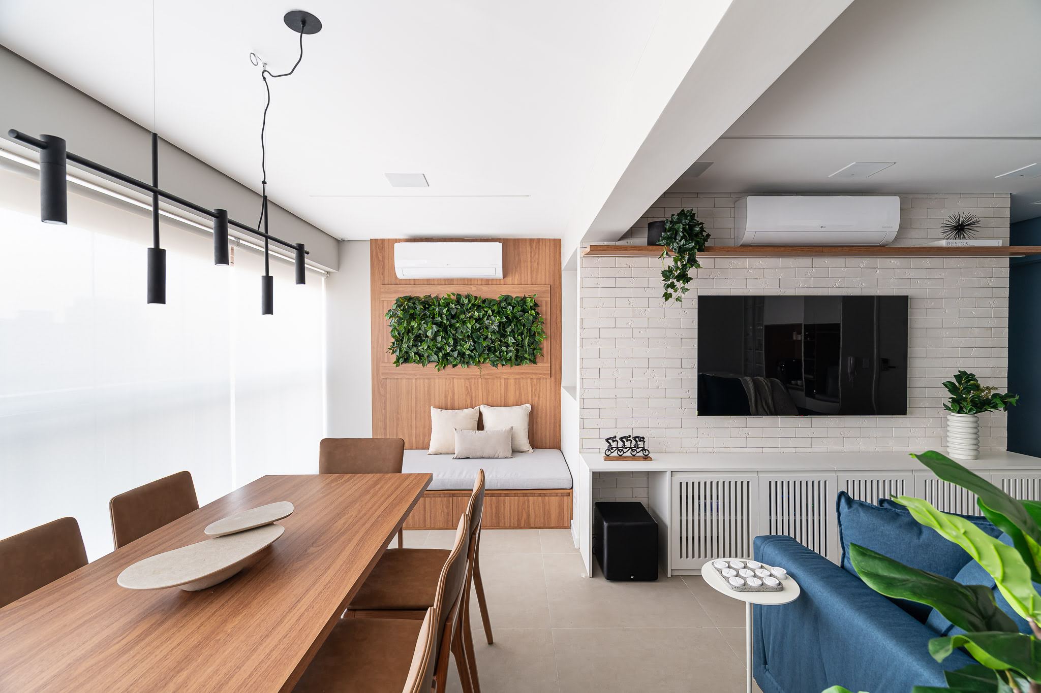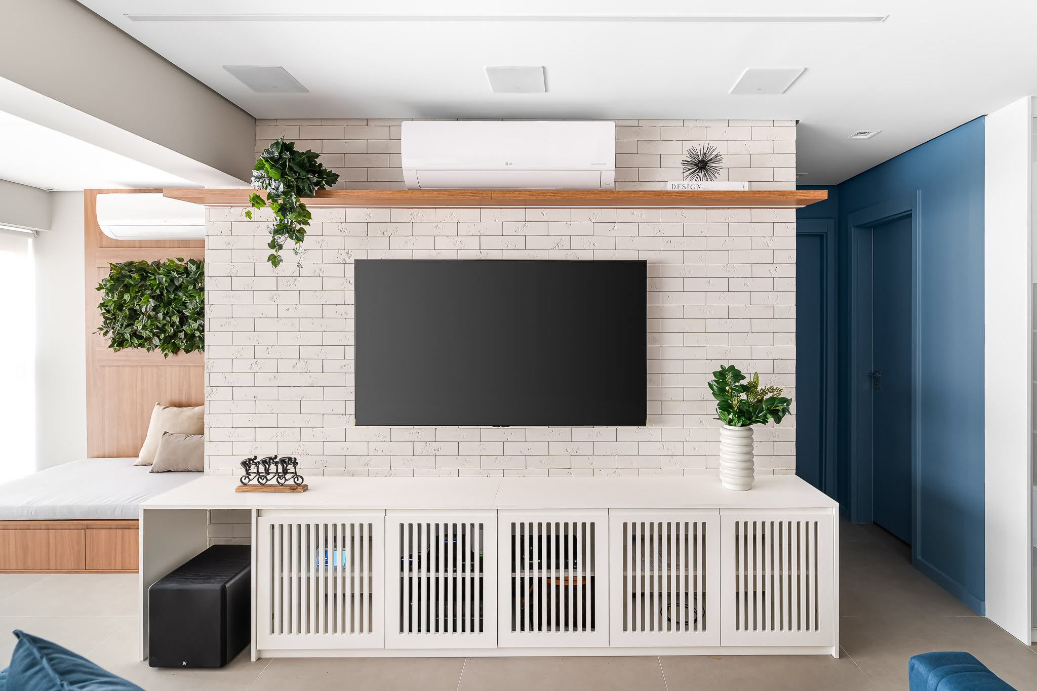 Parede Sala de Estar: Revestimento Tijolinho Cemento Branco – 7x23cm – Olivia Revestimentos